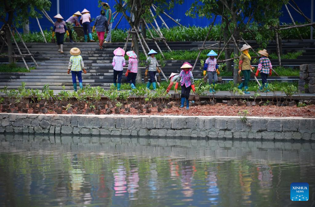 Workers plant seedlings at the riverside of Meishe River in Haikou, south China's Hainan Province, July 10, 2017. Dubbed the "mother river" of Haikou, Meishe was recently listed among "the country's 11 most beautiful hometown rivers" by the Ministry of Water Resources.(Xinhua/Guo Cheng)