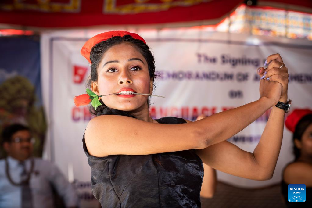 Students perform during an agreement signing ceremony on Chinese language teaching cooperation in Kathmandu, Nepal, March 21, 2022. The Confucius Institute at Nepal's Tribhuvan University signed a memorandum of agreement on Chinese language teaching cooperation with Bal Uddhar Secondary School in Kathmandu of Nepal Monday. (Photo by Hari Maharjan/Xinhua)