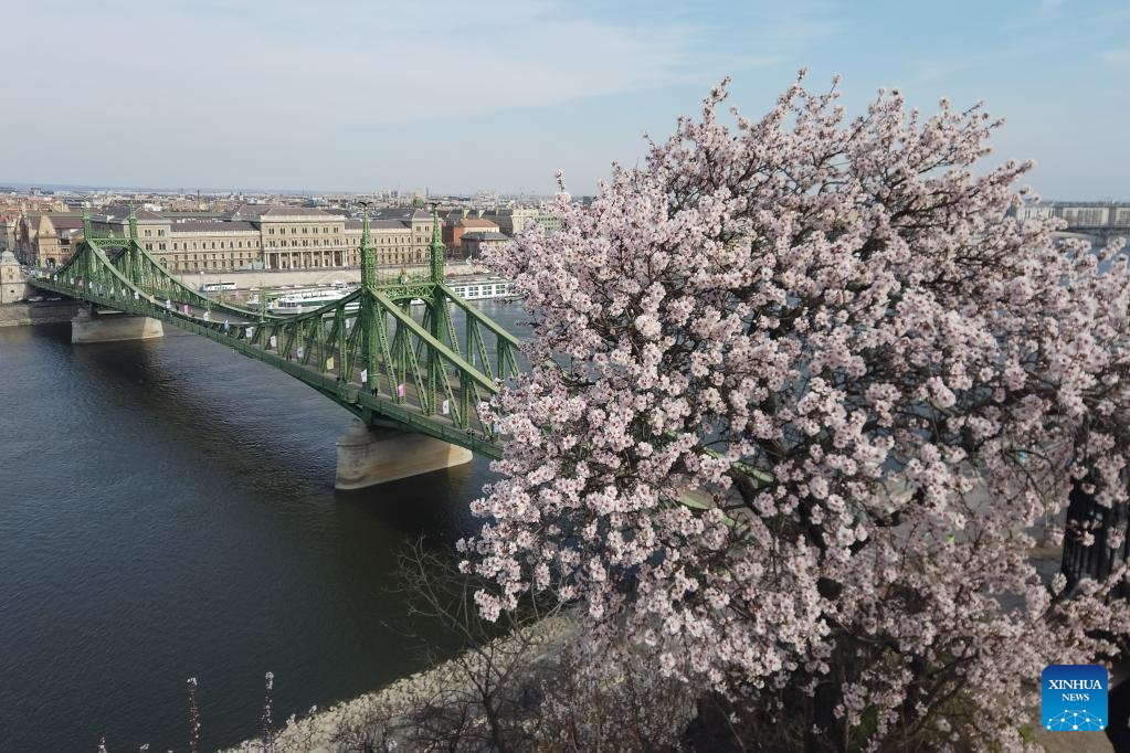 Blooming almond tree with the view of downtown of the city in the background is seen from a hill in Budapest, Hungary on March 20, 2022. (Photo by Attila Volgyi/Xinhua)