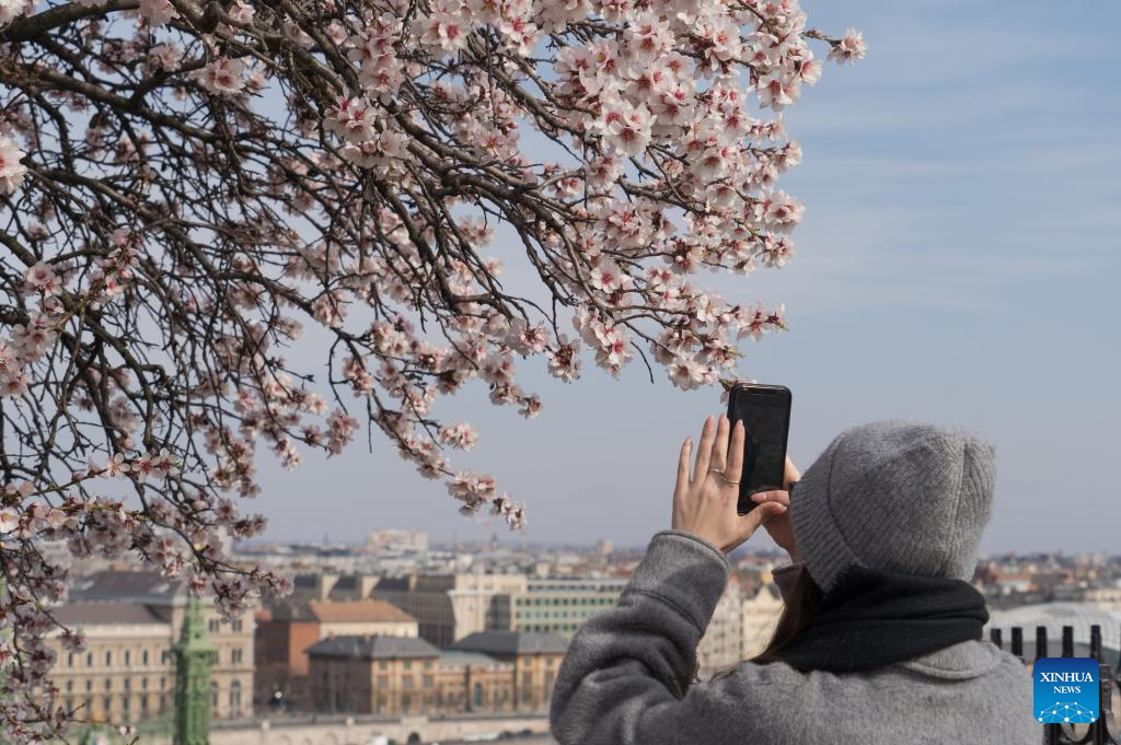 A woman takes photos of a blooming almond tree on a hill in Budapest, Hungary on March 20, 2022. (Photo by Attila Volgyi/Xinhua)