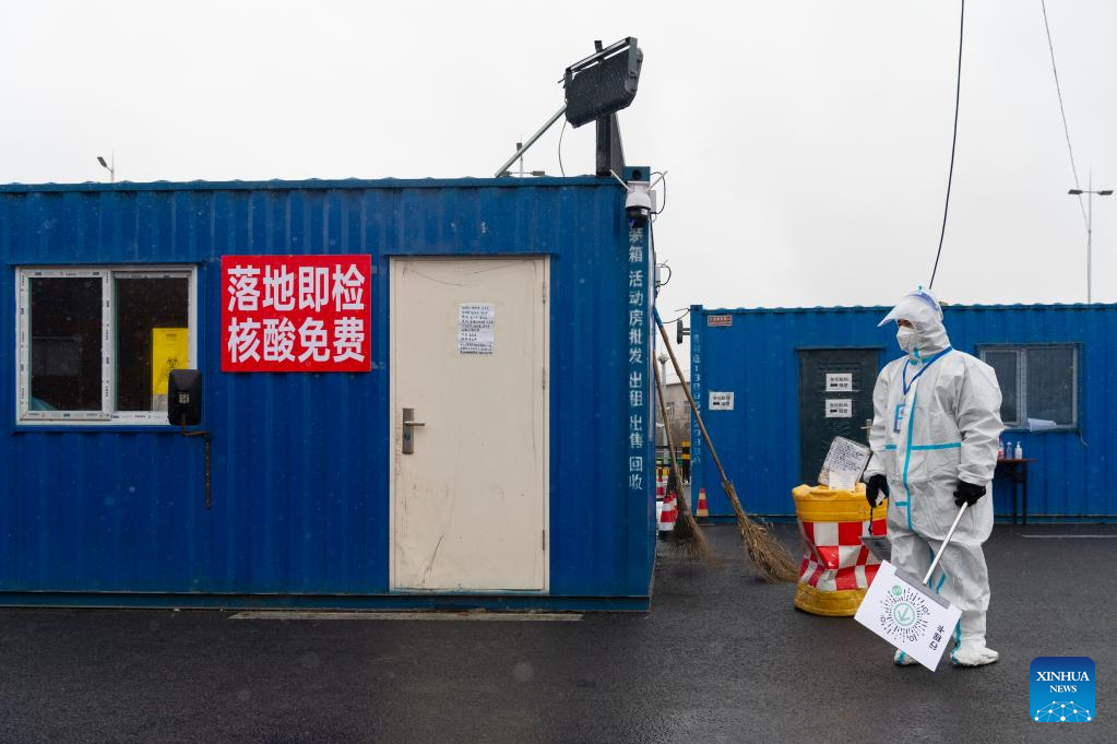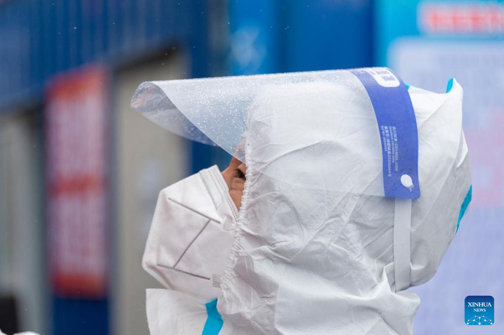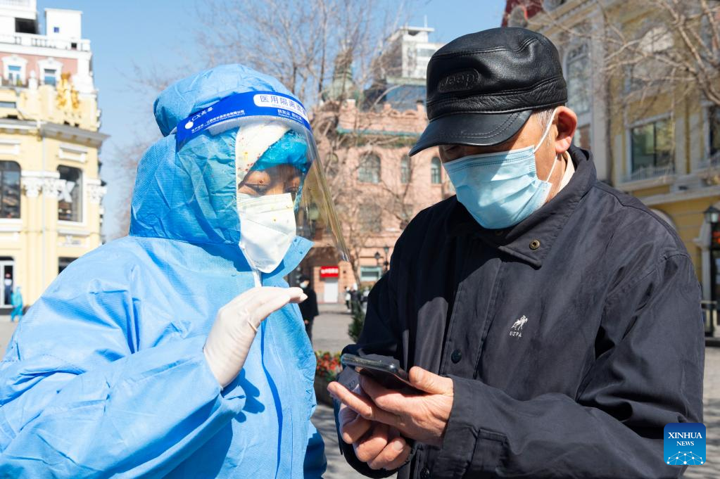 A medical worker collects samples for nucleic acid test at a testing site in Harbin, northeast China's Heilongjiang Province, March 20, 2022. In response to the COVID-19 outbreak, epidemic prevention and control workers in Harbin are on the front line, preventing the spread of the epidemic and protecting the health of citizens. (Xinhua/Xie Jianfei)