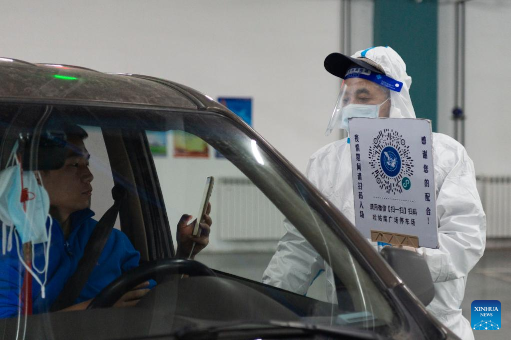 A staff member checks a driver at an underground parking lot of Harbin Railway Station in Harbin, northeast China's Heilongjiang Province, March 21, 2022. In response to the COVID-19 outbreak, epidemic prevention and control workers in Harbin are on the front line, preventing the spread of the epidemic and protecting the health of citizens. (Xinhua/Xie Jianfei)