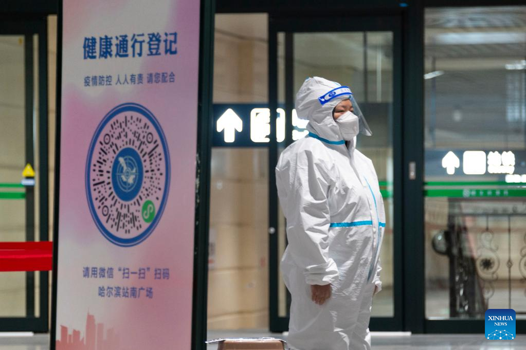 A staff member stands guard at the entrance of Harbin Railway Station in Harbin, northeast China's Heilongjiang Province, March 21, 2022. In response to the COVID-19 outbreak, epidemic prevention and control workers in Harbin are on the front line, preventing the spread of the epidemic and protecting the health of citizens. (Xinhua/Xie Jianfei)