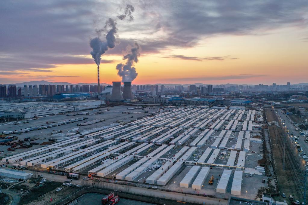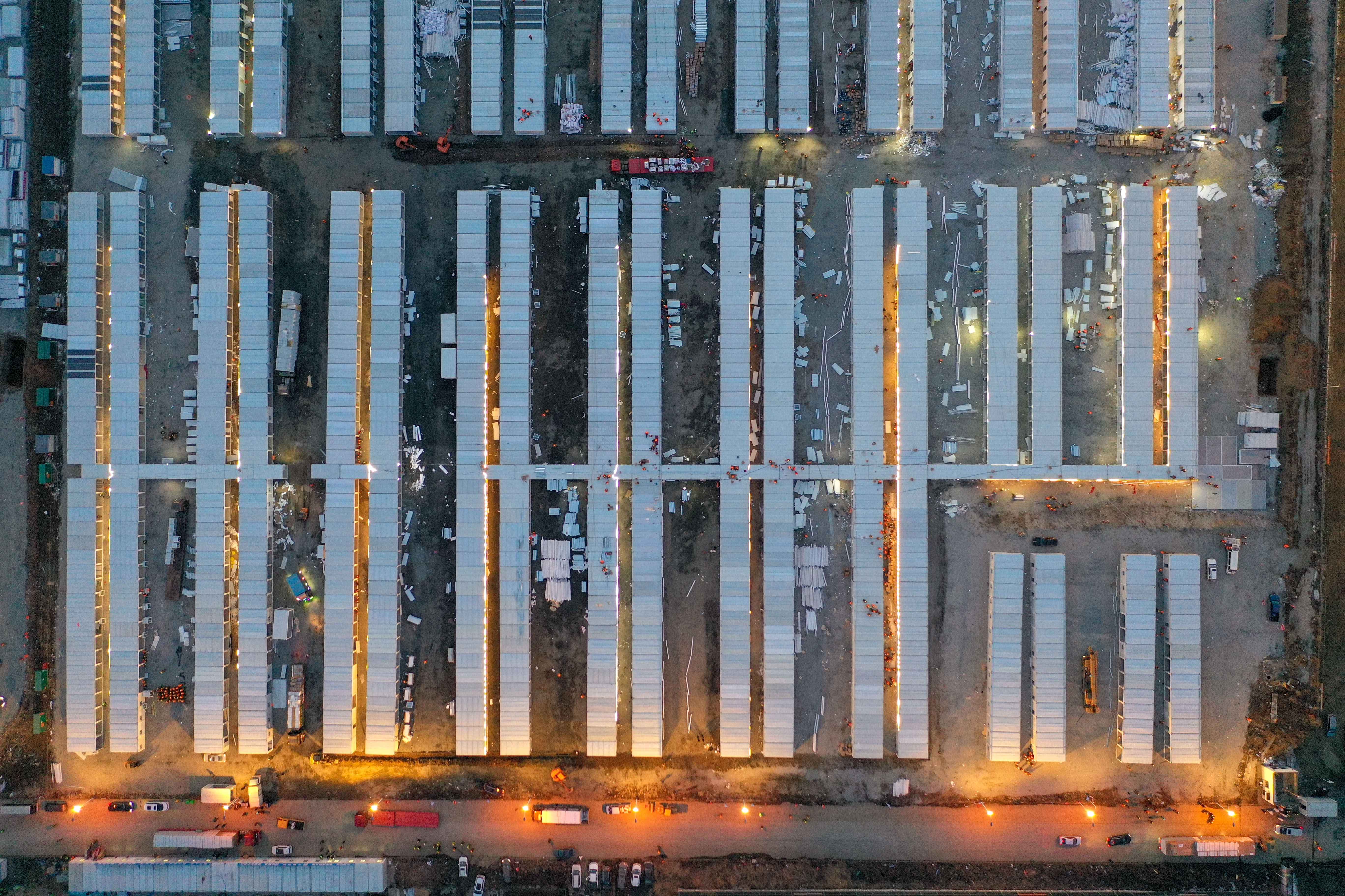 Aerial photo taken on March 20, 2022 shows temporary quarantine facilities under construction in Jilin City, northeast China's Jilin Province. (Xinhua/Zhang Nan)