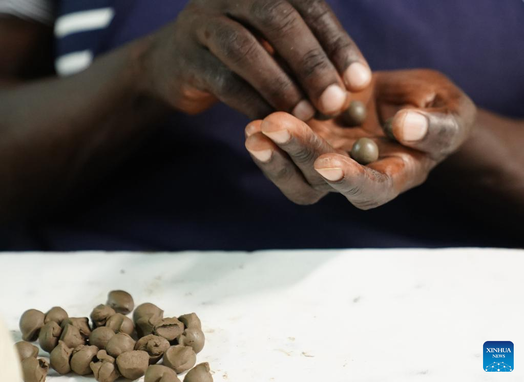 A woman makes beads with pottery earth at the Kazuri workshop in Nairobi, Kenya, on March 21, 2022. Kazuri, Swahili name for "small and beautiful," is a famous local brand for hand-made and hand-painted ceramic beads, jewelry and pottery in Kenya. The Kazuri workshop in Kazen has employed over 340 women, mostly single mothers. (Xinhua/Dong Jianghui)