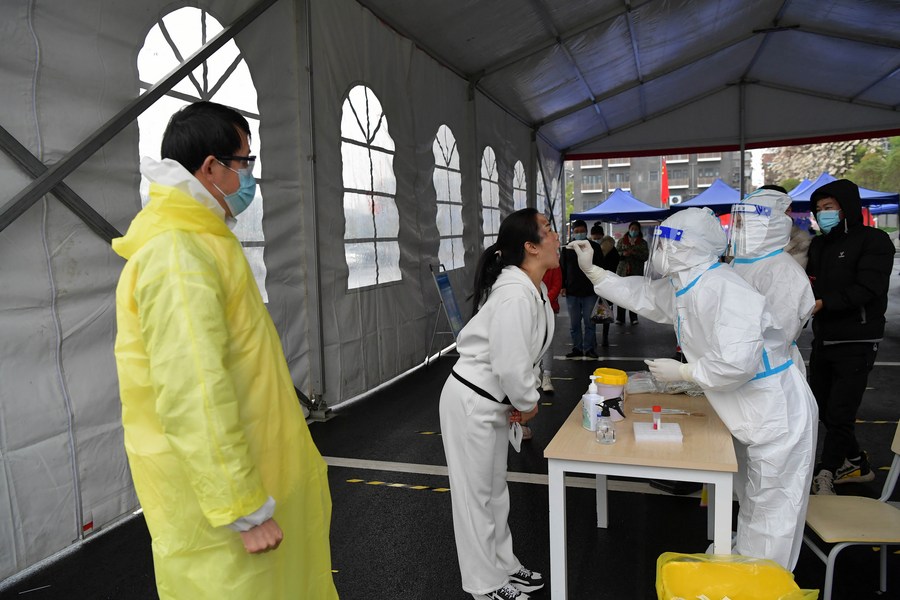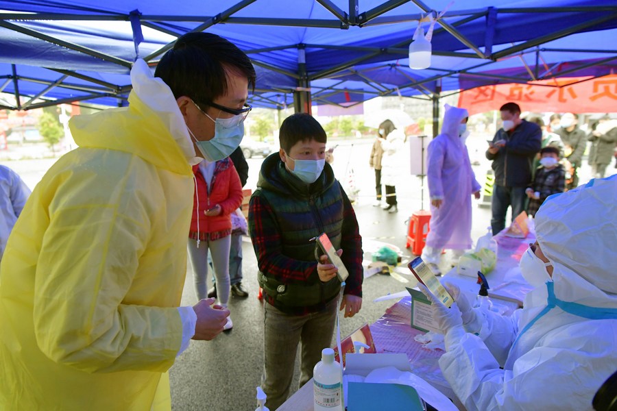 Li Huanqiu (1st L) uses sign language to guide hearing-impaired residents during a COVID-19 nucleic acid test at a testing site in Nanchang, east China's Jiangxi Province, March 21, 2022. (Xinhua/Peng Zhaozhi)