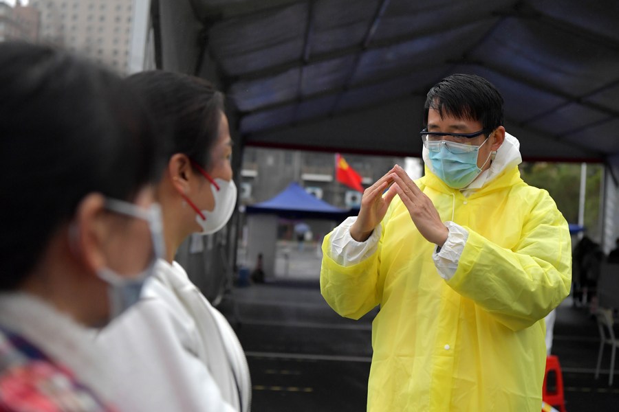 Li Huanqiu provides hearing-impaired residents with home quarantine guidance at a COVID-19 nucleic acid testing site in Nanchang, east China's Jiangxi Province, March 21, 2022. (Xinhua/Peng Zhaozhi)