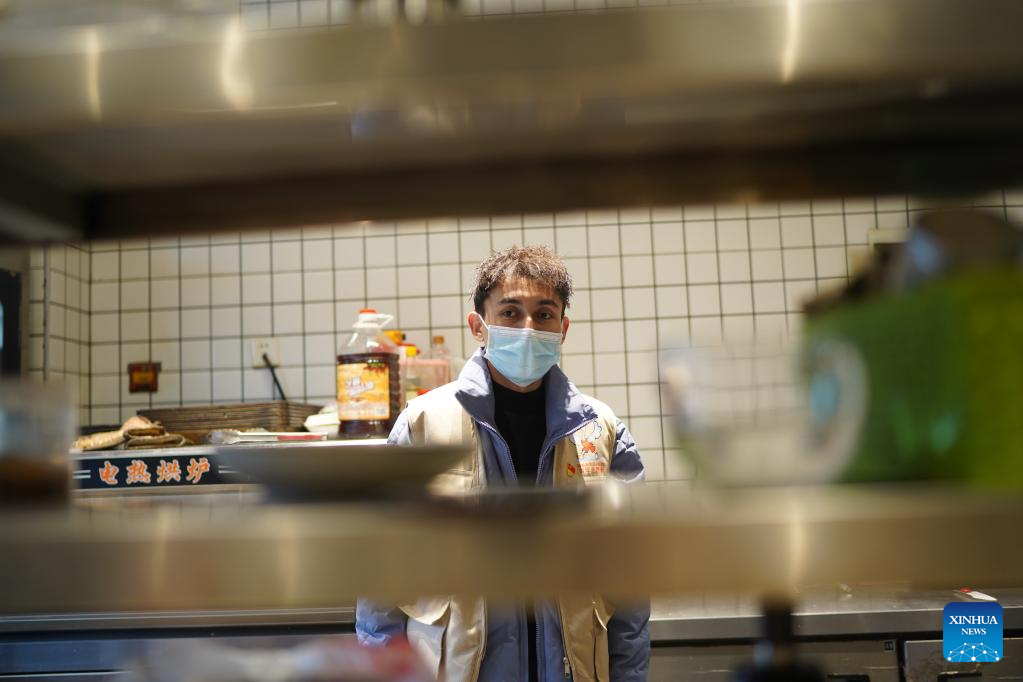 Miradil Mamtawla prepares for work in Nanchang, east China's Jiangxi Province, March 22, 2022. Miradil Mamtawla is from northwest China's Xinjiang Uygur Autonomous Region. The 29-year-old came to Nanchang in 2013 to attend university and started his own business after graduation. The COVID-19 outbreak in 2020 had a significant impact on his business. At the most difficult time, the local government provided loans and other supportive measures to help his business. After a resurgence of COVID-19 hit Nanchang this year, Miradil and his team joined a volunteer team, providing free meals to frontline essential workers. His team has already delivered over 1,000 naan buns. "The city of Nanchang helped me in the hardest time of my life, and now it's time for me to repay that kindness," he said. (Xinhua/Zhou Mi)
