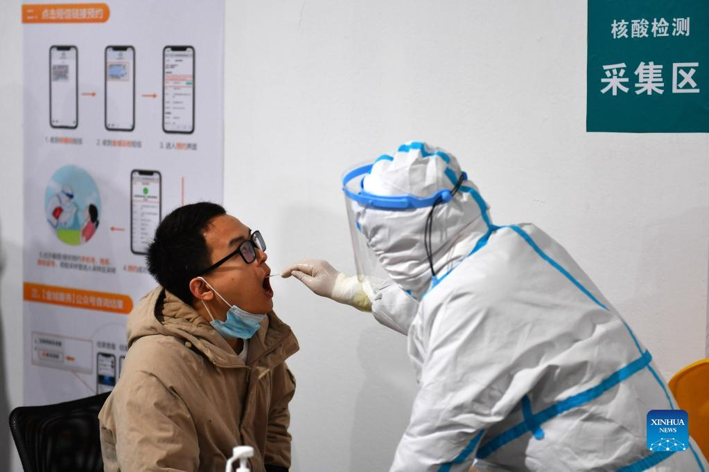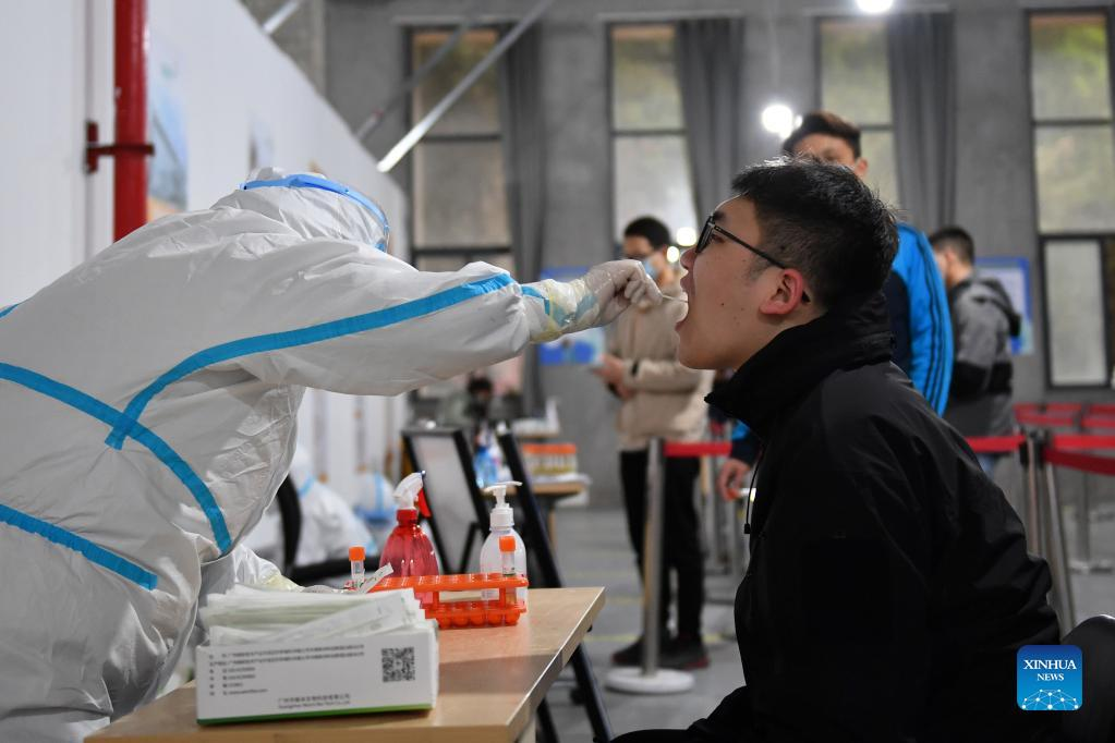 A medical worker takes a swab sample from a resident for COVID-19 nucleic acid test in Changsha, central China's Hunan Province, March 22, 2022. (Xinhua/Chen Zhenhai)
