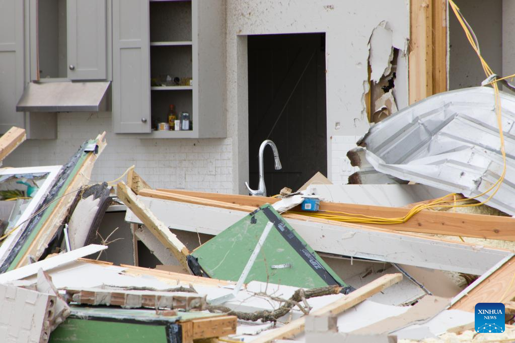 Photo taken on March 22, 2022 shows a house damaged by a tornado in Jacksboro, northern Texas, the United States. Many people were injured after several tornadoes on Monday ripped through parts of the south-central U.S. states of Texas and Oklahoma, officials said. (Photo by Dan Tian/Xinhua)