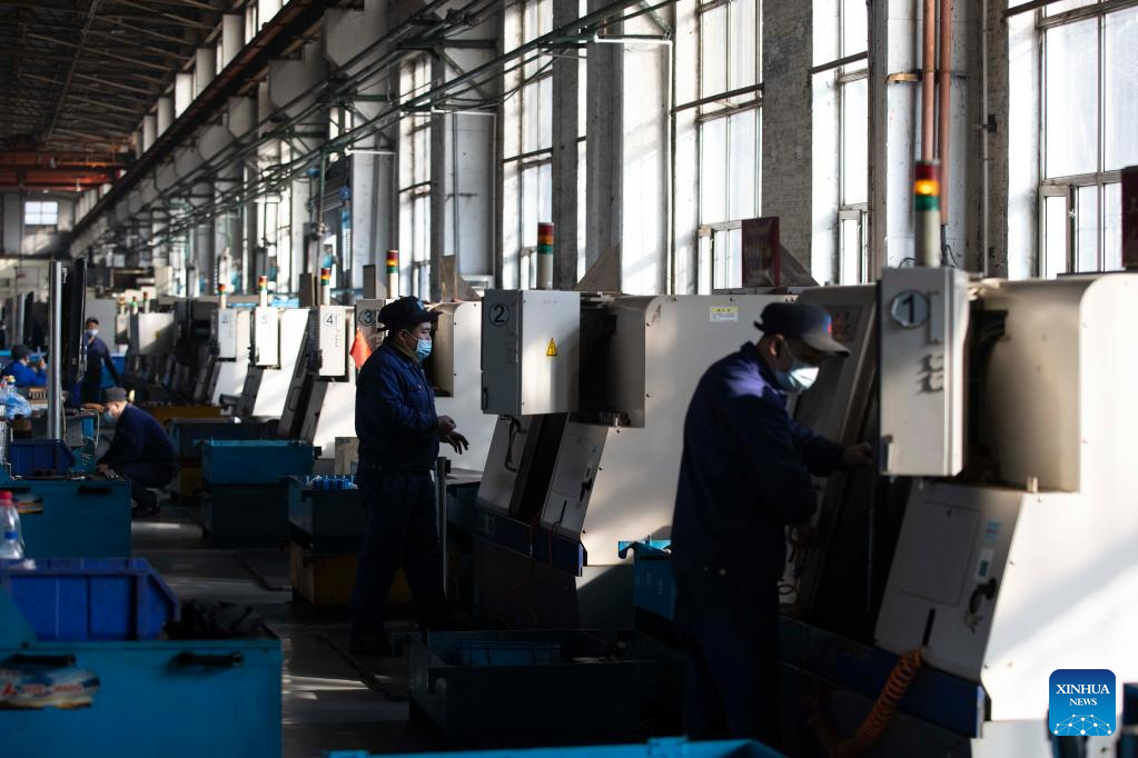 Staff members work at Dongan Auto Engine Co., Ltd. in Harbin, northeast China's Heilongjiang Province, March 23, 2022. Manufacturing firms above a designated size have been facilitating production with epidemic control and prevention measures in Harbin, as an effort to minimize the impact of the COVID-19 on economic and social development. (Xinhua/Zhang Tao)