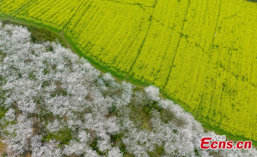 Photo shows the picturesque scenery of blooming cherry blossoms in Anhui, March 20, 2022. (Photo: China News Service/Li Xiaohong)