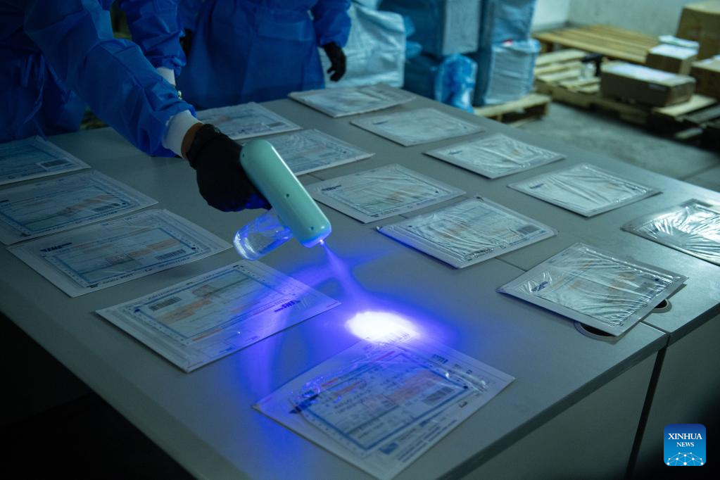 A staff member with Macao Post disinfects mails in south China's Macao, March 23, 2022. (Xinhua/Cheong Kam Ka)