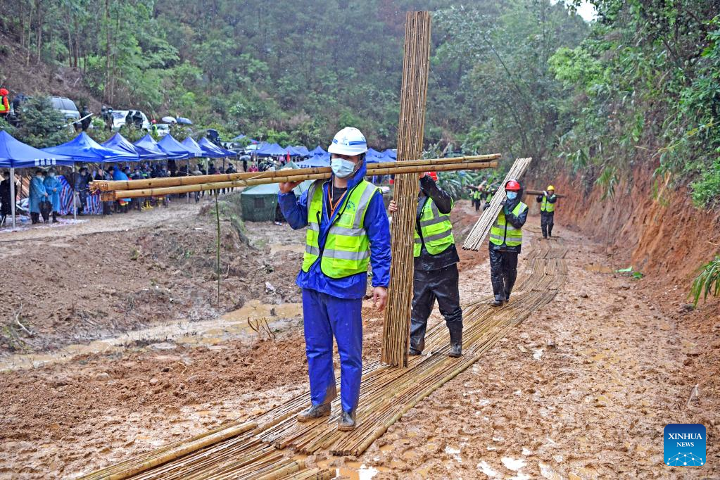 Rescue workers carry weaved bamboo to lay on a road leading to the plane crash site in Tengxian County, south China's Guangxi Zhuang Autonomous Region, March 23, 2022.