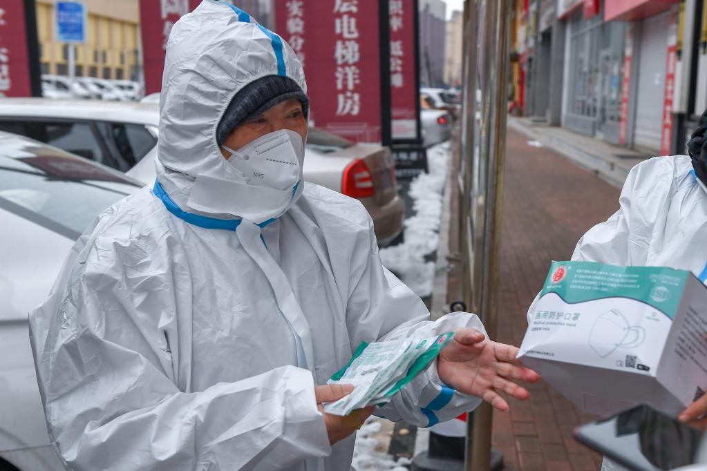 A volunteer sends personal protective supplies to a community in Jilin City, northeast China's Jilin Province, March 18, 2022. (Xinhua/Zhang Nan)