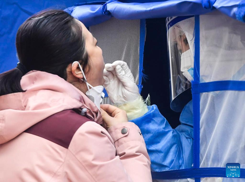 A medical worker takes a swab sample from a resident for nucleic acid test at a COVID-19 testing site in Changchun, northeast China's Jilin Province, March 24, 2022. (Xinhua/Zhang Jian)