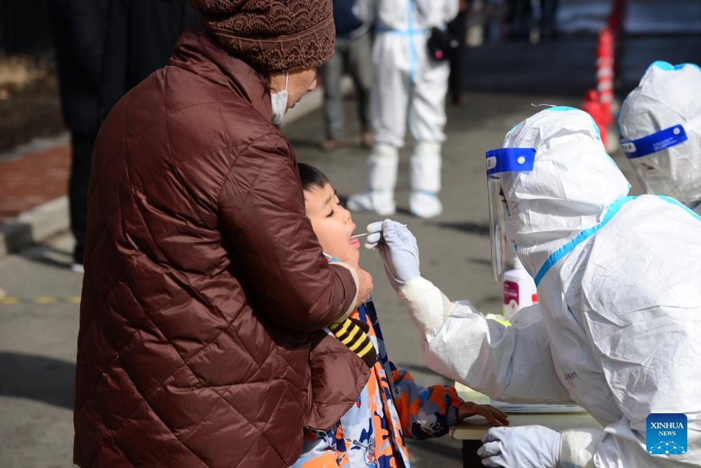 A medical worker takes a swab sample from a child for nucleic acid test at a COVID-19 testing site in Changchun, northeast China's Jilin Province, March 24, 2022. (Xinhua/Zhang Jian)