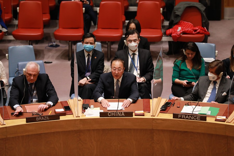 Zhang Jun (C, front), China's permanent representative to the United Nations, makes his explanatory remarks after the vote on the humanitarian situation in Ukraine, at the UN headquarters in New York, on March 23, 2022. (Xinhua/Xie E)