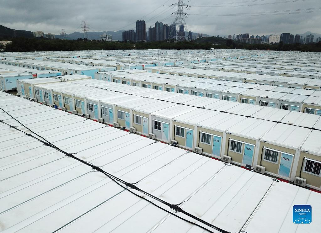 Aerial photo taken on March 24, 2022 shows the community isolation facility (CIF) in Yuen Long, south China's Hong Kong. The CIF in Hong Kong's Yuen Long, constructed with the support from the mainland, was handed over to the Hong Kong Special Administrative Region (HKSAR) government on Thursday, marking the full completion of the first phase of mainland-aided medical facilities in Hong Kong. (Xinhua/Li Gang)