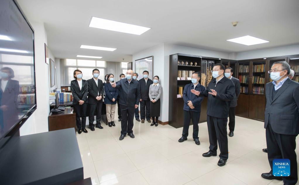 Chinese Premier Li Keqiang, also a member of the Standing Committee of the Political Bureau of the Communist Party of China Central Committee, makes an inspection of the Ministry of Agriculture and Rural Affairs and chairs a symposium, March 23, 2022. (Xinhua/Li Tao)