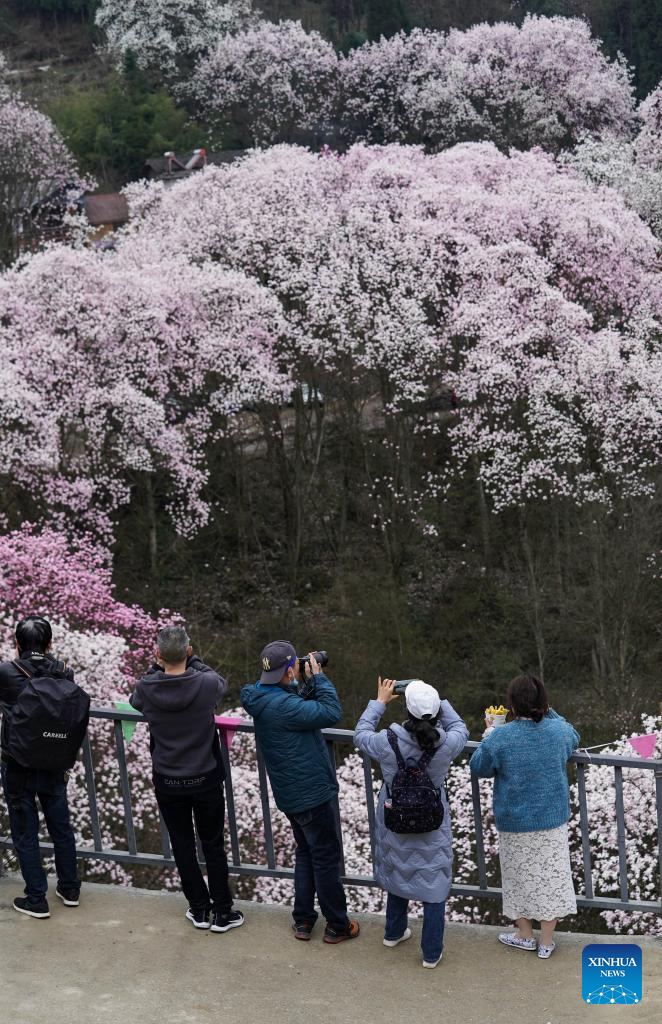 People take photos of magnolia flowers in Daitianshan Village of Jiangyou, southwest China's Sichuan Province, March 23, 2022. (Xinhua/Jiang Hongjing)