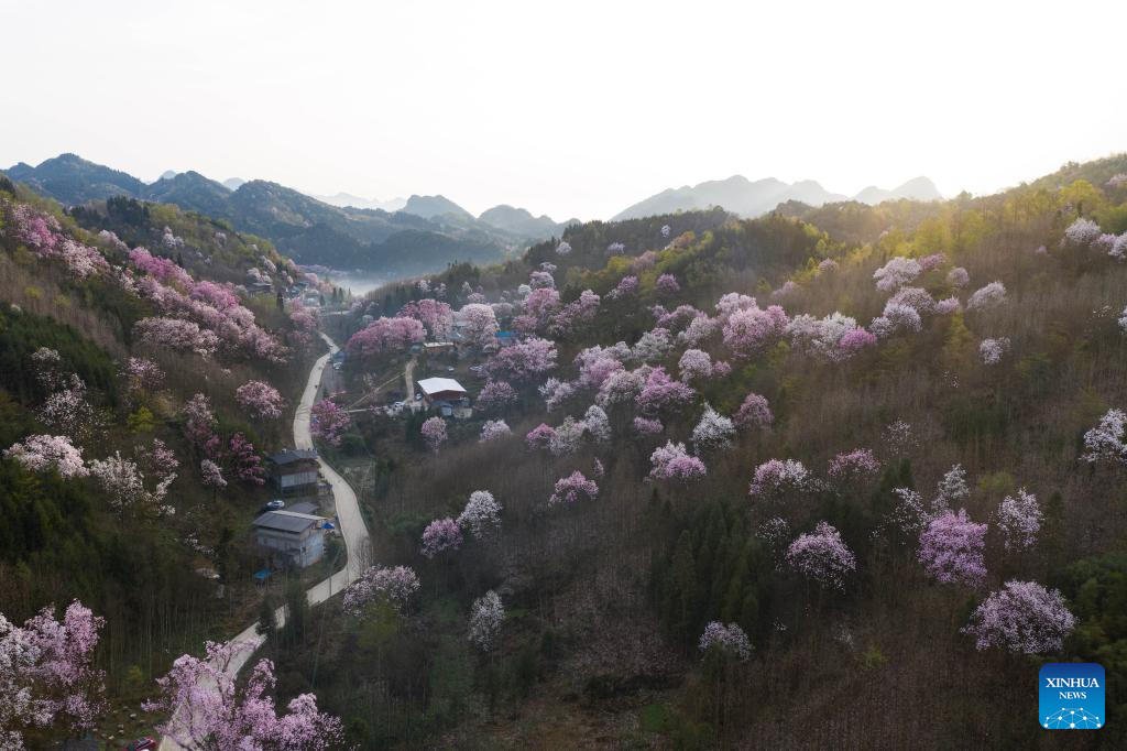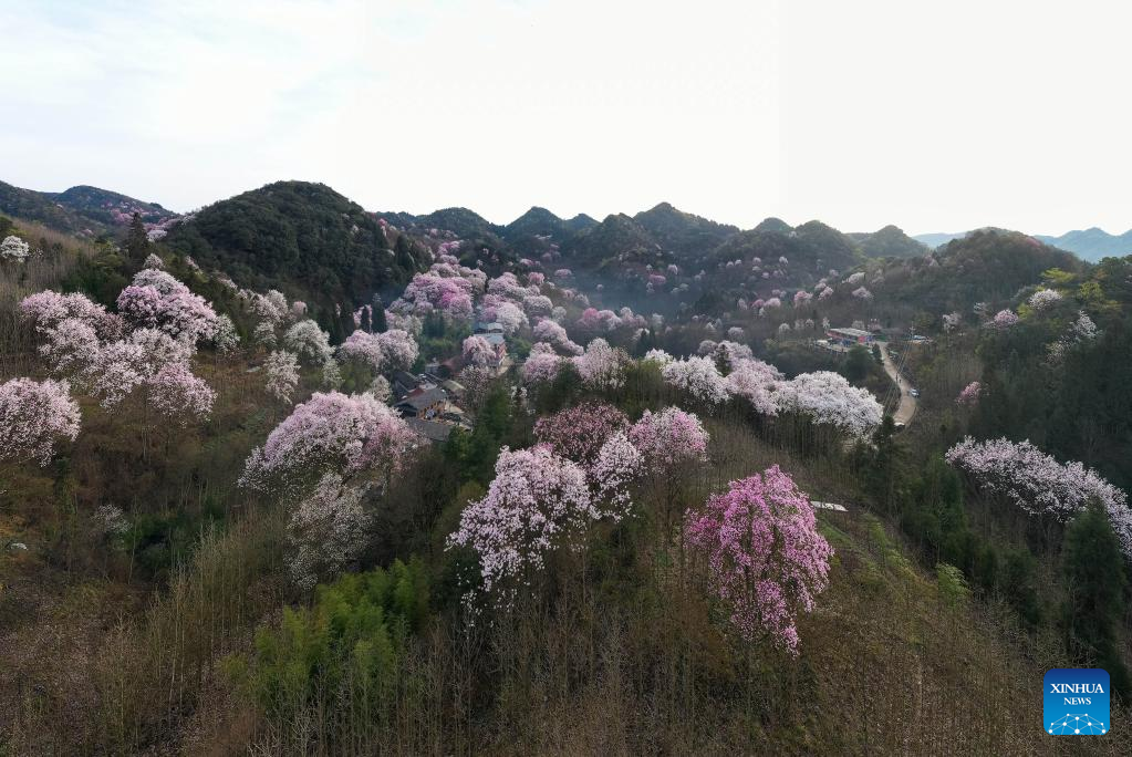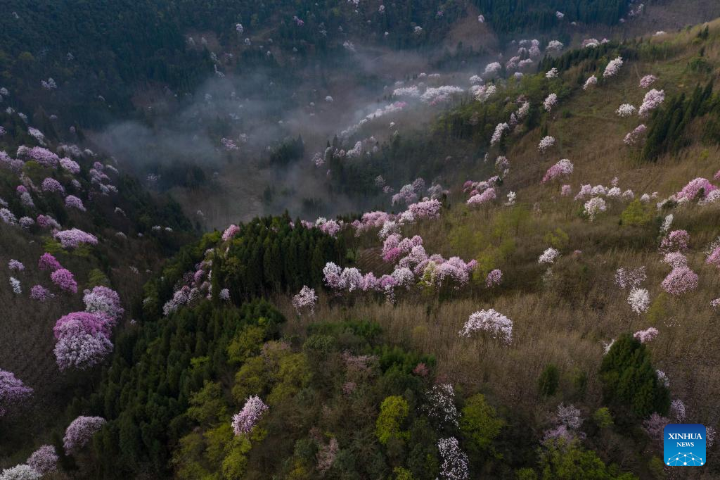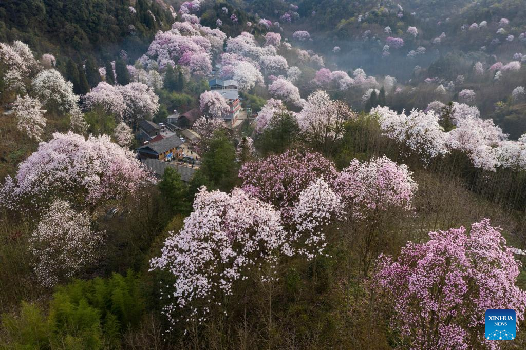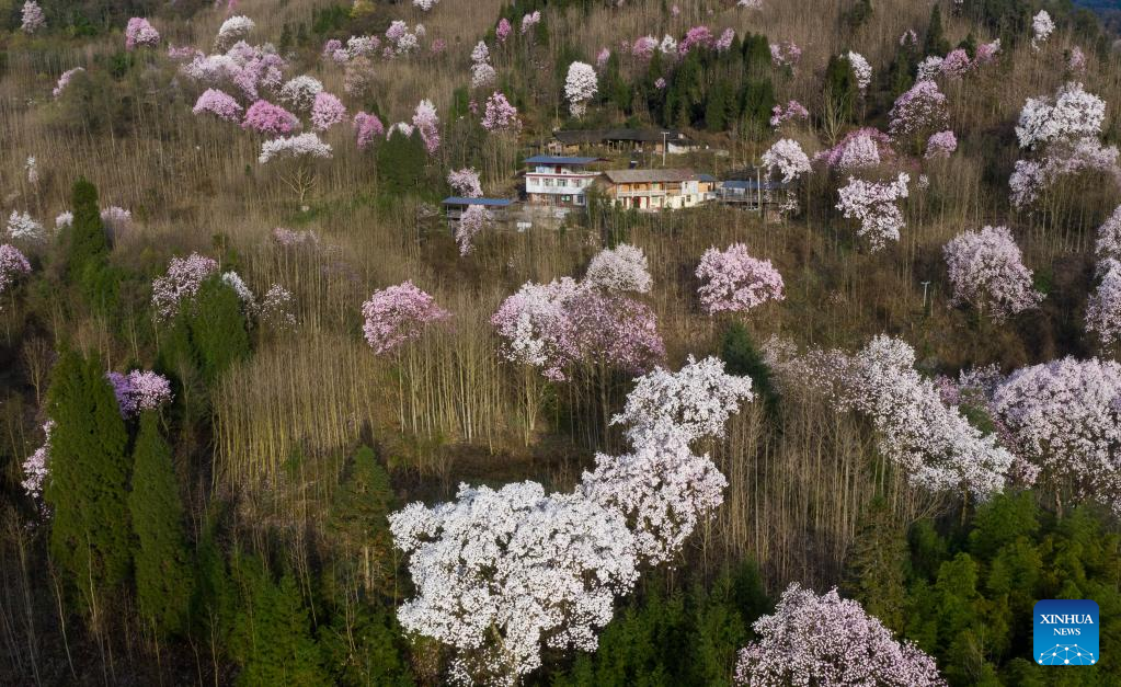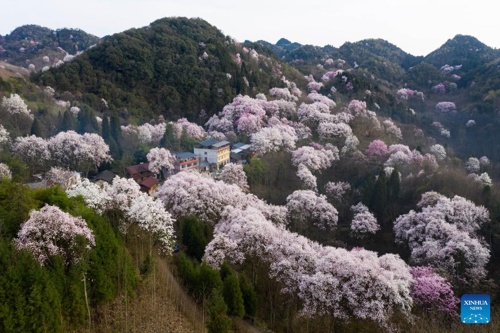 Aerial photo taken on March 23, 2022 shows magnolia flowers in full bloom in Daitianshan Village of Jiangyou, southwest China's Sichuan Province. (Xinhua/Jiang Hongjing)