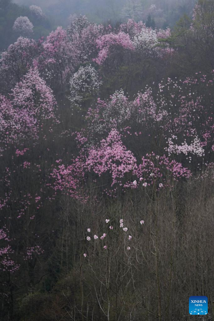 Photo taken on March 23, 2022 shows magnolia flowers in full bloom in Daitianshan Village of Jiangyou, southwest China's Sichuan Province. (Xinhua/Jiang Hongjing)
