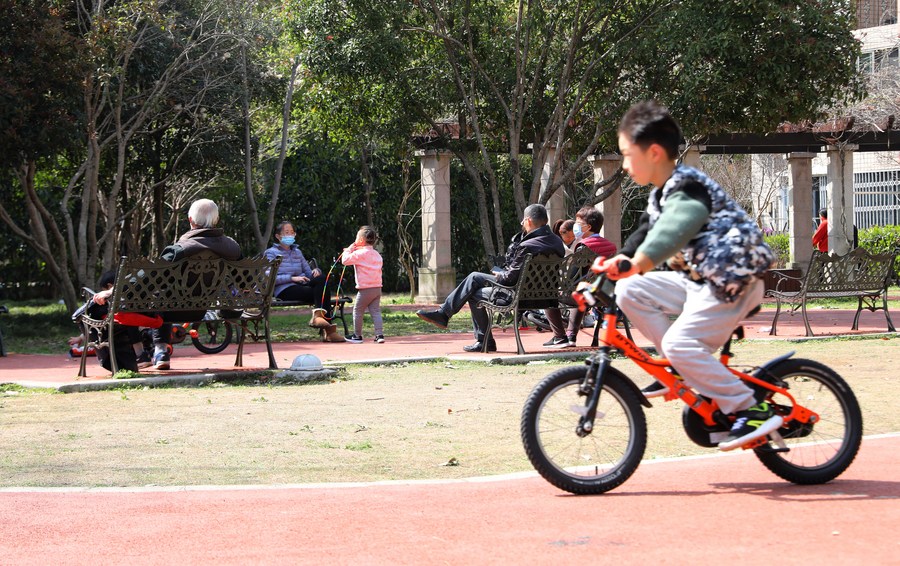 Citizens are on their way to work at an industrial park in Shenzhen, south China's Guangdong Province, March 21, 2022. (Photo by Li Weiwen/Xinhua)