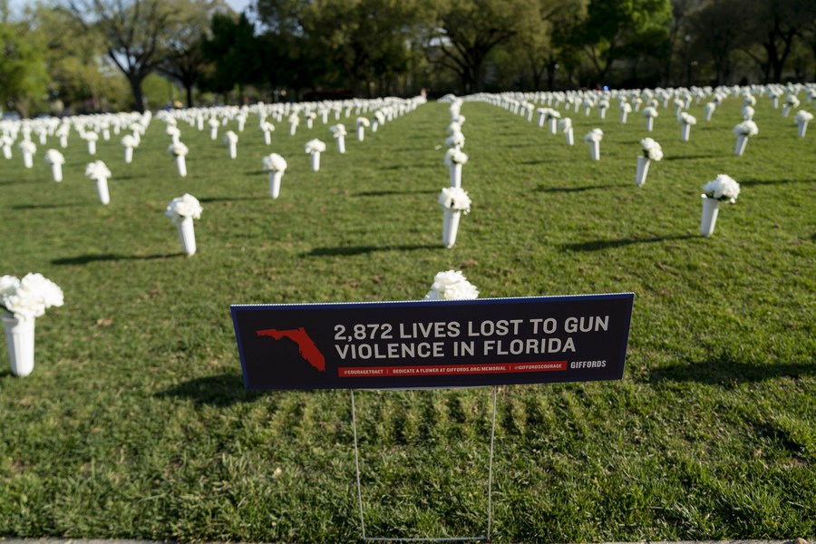 Photo taken on April 13, 2021 shows 40,000 white silk flowers installed on the National Mall to honor the nearly 40,000 Americans who die every year from gun violence in Washington, D.C., the United States. (Xinhua/Liu Jie)