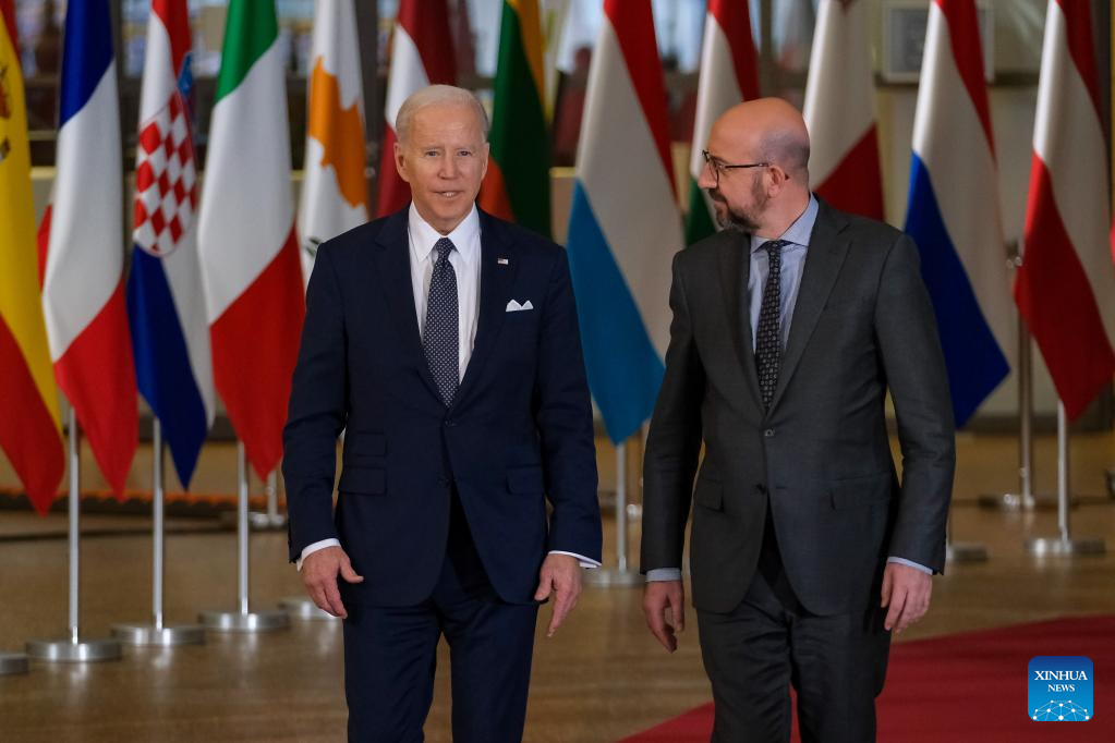 U.S. President Joe Biden (L) and European Council President Charles Michel arrive for the meeting of European Union (EU) leaders in Brussels, Belgium, March 24, 2022. U.S. President Joe Biden has said he was in favor of Russia being excluded from the Group of 20 (G20). Biden is in Brussels to attend three summits addressing the Russia-Ukraine conflict, including the NATO extraordinary summit, the Group of Seven summit and the European Council meeting. (Xinhua/Zhang Cheng)