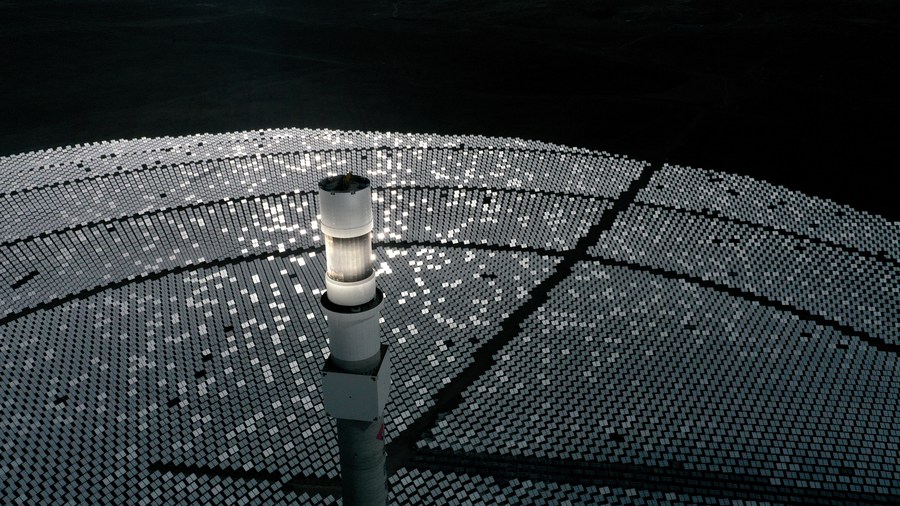 Aerial photo taken on March 3, 2021 shows a solar thermal power project in Gonghe County, northwest China's Qinghai Province. (Xinhua/Zhang Hongxiang)