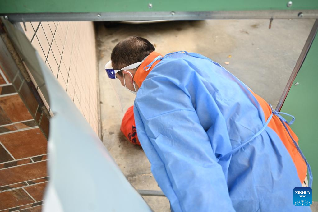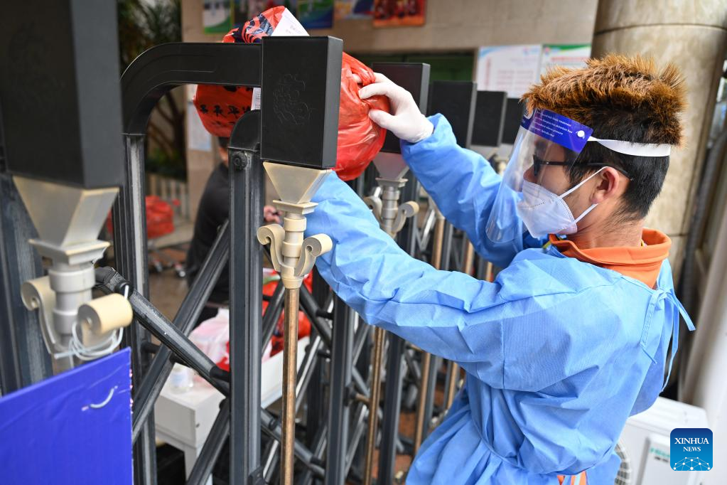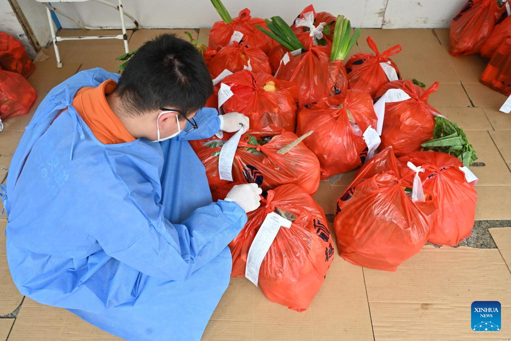A courier puts daily necessities ordered by residents to a designated site in Quanzhou, southeast China's Fujian Province, March 26, 2022. More than 100 local express delivery couriers have volunteered to deliver goods for residents amid the recent COVID-19 resurgence in Quanzhou. (Photo by Zhou Yi/Xinhua)