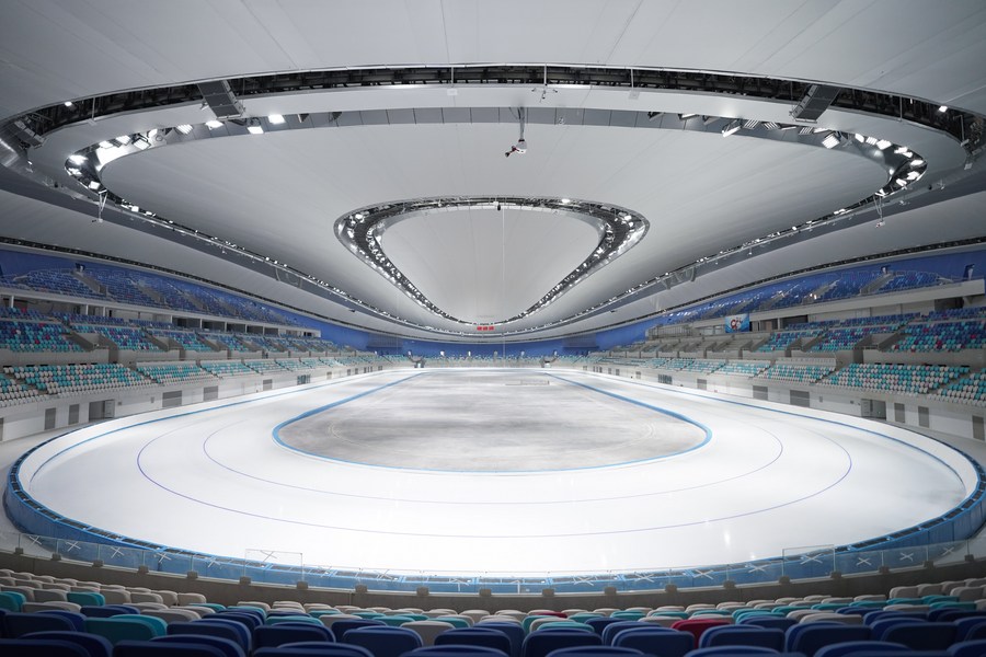 Photo taken on Jan. 22, 2021 shows the interior view of the National Speed Skating Oval in Beijing, capital of China. (Xinhua/Ju Huanzong)