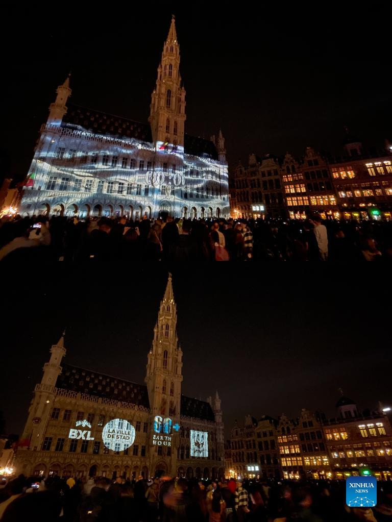 Combo photo shows the Brussels Town Hall before (top) and during Earth Hour in Brussels, Belgium, on March 26, 2022. (Xinhua/Zheng Huansong)