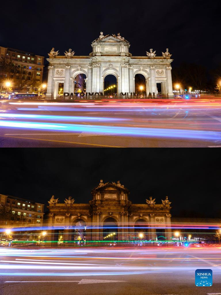 Combo photo shows the Alcala Gate before (top) and during Earth Hour in Madrid, Spain on March 26, 2022. (Xinhua/Meng Dingbo)