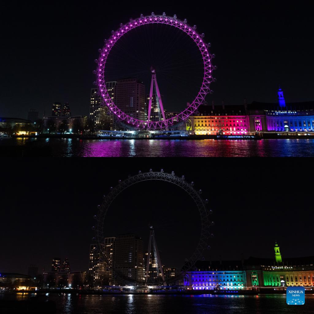 Combo photo shows the London Eye before (top) and during Earth Hour in London, Britain, on March 26, 2022. (Photo by Ray Tang/Xinhua)