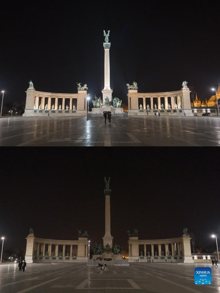 Combo photo shows the Heroes' Square before (top) and during Earth Hour in Budapest, Hungary on March 26, 2022. (Photo by Attila Volgyi/Xinhua)