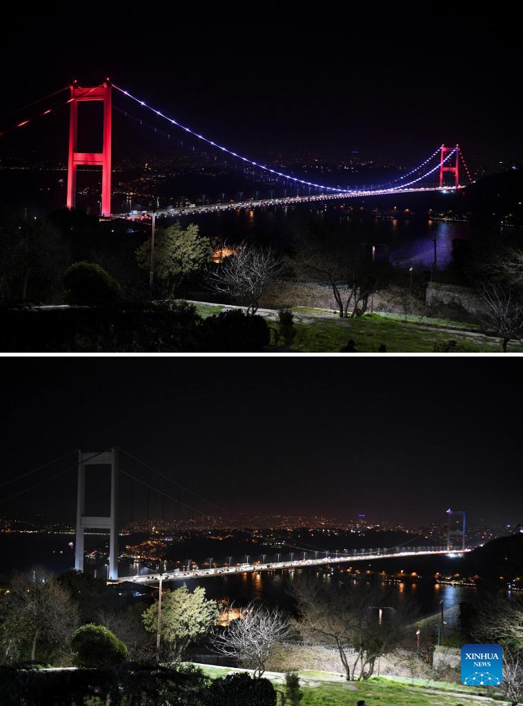 Combo photo shows a bridge over the Bosphorus Strait before (top) and during Earth Hour in Istanbul, Turkey, on March 26, 2022. (Xinhua/Shadati)