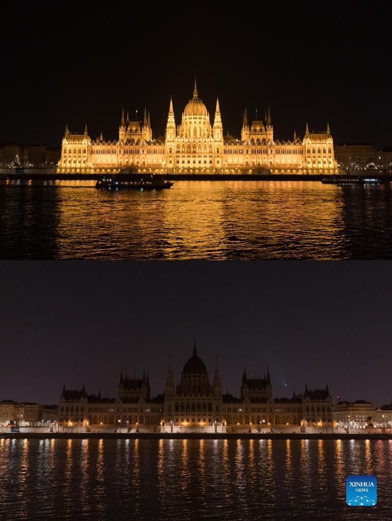 Combo photo shows the Hungarian Parliament building before (top) and during Earth Hour in Budapest, Hungary on March 26, 2022. (Photo by Attila Volgyi/Xinhua)