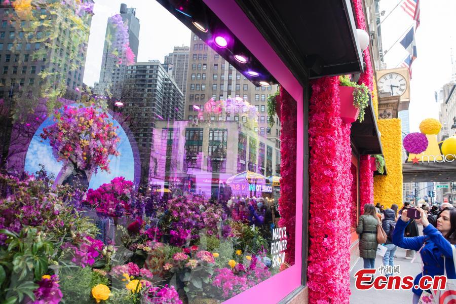 A view of the window displays on the opening day at Macy's Herald Square flagship store in New York, the United States, March 27, 2022. (Photo: China News Service/Liao Pan)