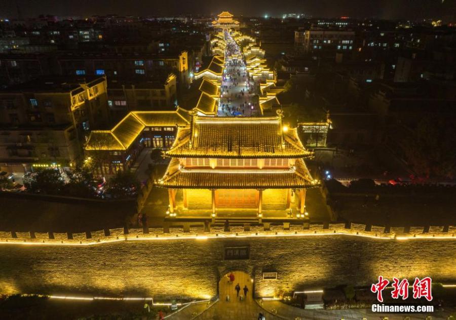 Aerial photo shows the view of illuminated downtown Xiangyang, central China's Hubei Province, March 27, 2022. Xiangyang is an ancient city with a history of more than 2,800 years and was first built in the Han Dynasty (206BC-220AD). (Photo: China News Service/Yang Dong)