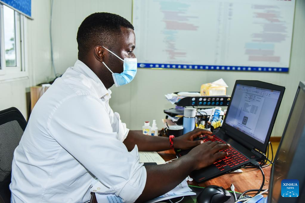 Photo taken on March 15, 2022 shows Eric Defo Fotso, engineer of the China Harbour Engineering Company Ltd (CHEC), working in his office in Kribi, Cameroon. (Photo by Kepseu/Xinhua)