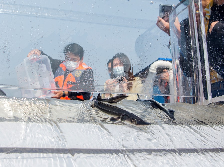Staff releases Chinese sturgeons into the Wuhan section of the Yangtze River in central China's Hubei Province, March 28, 2022. (Xinhua/Wu Zhizun)