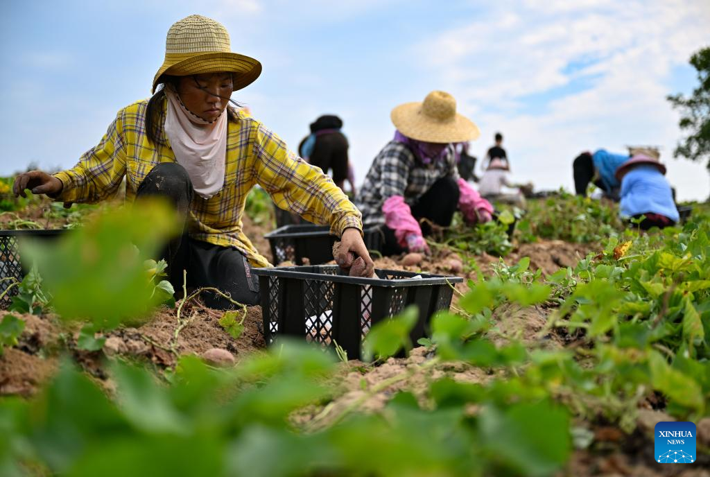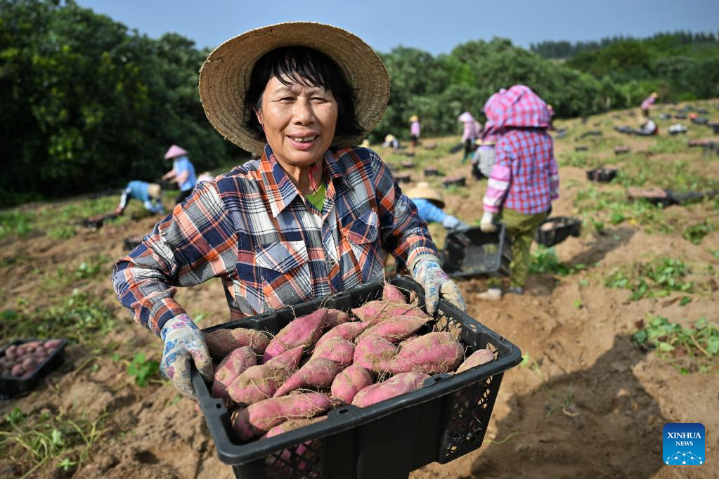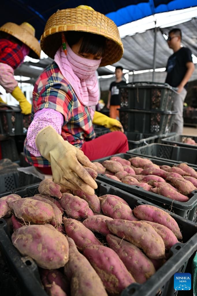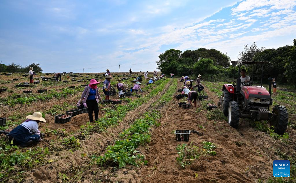 Workers harvest sweet potatoes in the fields of Wenchang City in south China's Hainan Provinceon March 26, 2022. The harvest season has started in Wenchang City in Hainan as farmers are busy picking and packing chestnuts, sweet potatoes, and pineapples. Fieldsacross the cityare already a hive of activity. (Xinhua/Guo Cheng)