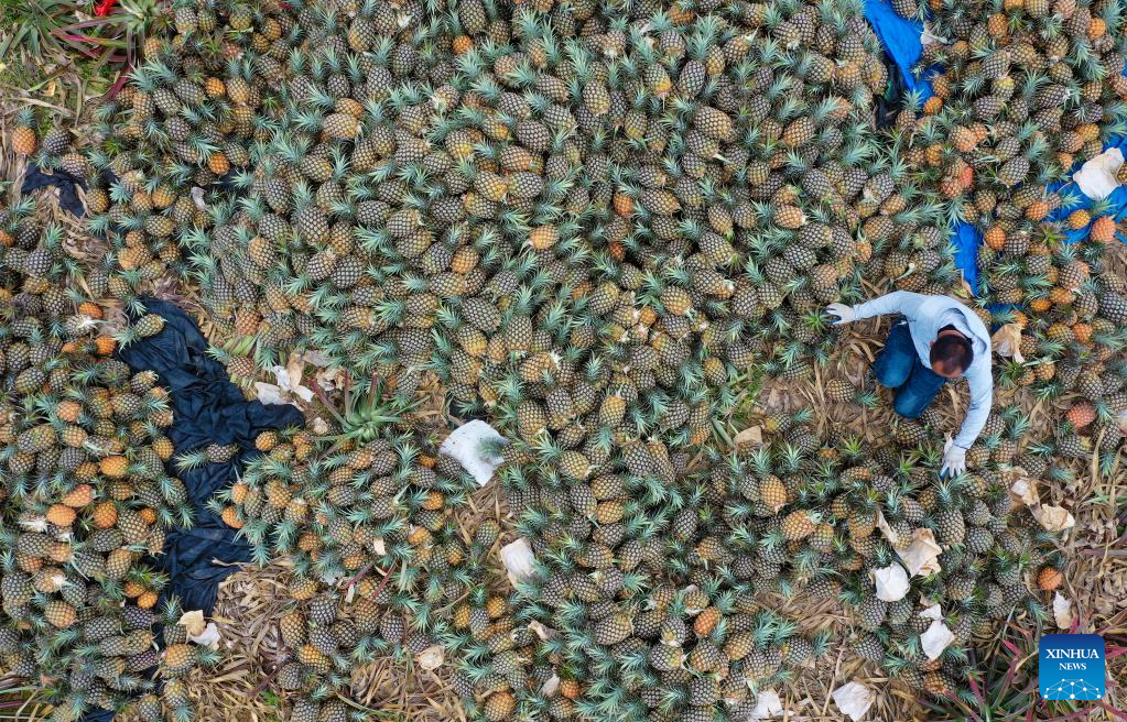 Workers harvest pineapples in the fields of Wenchang City in south China's Hainan Province on March 26, 2022.The harvest season has started in Wenchang City in Hainan as farmers are busy picking and packing chestnuts, sweet potatoes, and pineapples. Fieldsacross the city are already a hive of activity.(Xinhua/Guo Cheng)