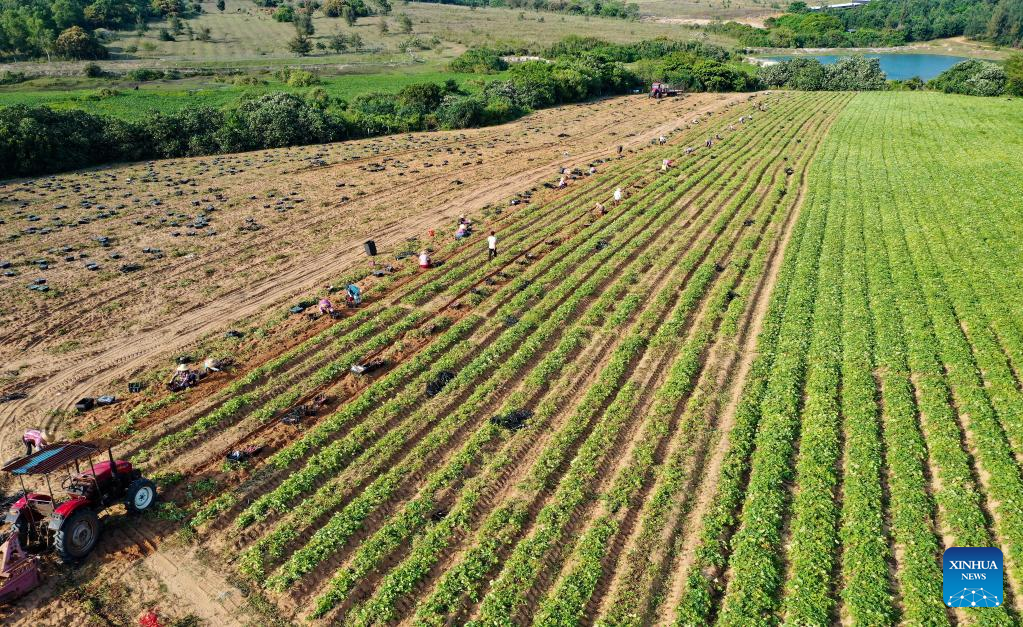 Workers harvest sweet potatoes in the fields of Wenchang City in south China's Hainan Provinceon March 26, 2022. The harvest season has started in Wenchang City in Hainan as farmers are busy picking and packing chestnuts, sweet potatoes, and pineapples. Fieldsacross the city are already a hive of activity.(Xinhua/Guo Cheng)