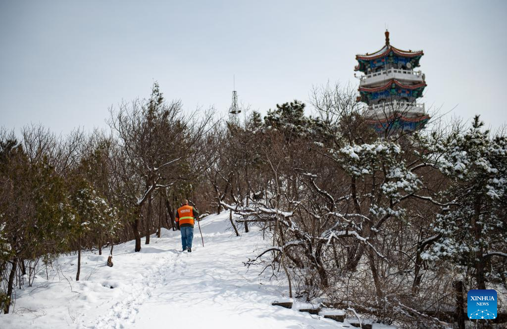 Song Chen cleans the snow in the yard outside the watchtower on Mangshan Mountain in Beijing, capital of China, March 19, 2022.