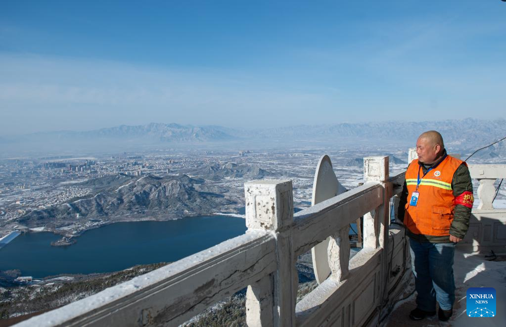 Aerial photo taken on March 19, 2022 shows Song Chen up for work at the watchtower on Mangshan Mountain in Beijing, capital of China.