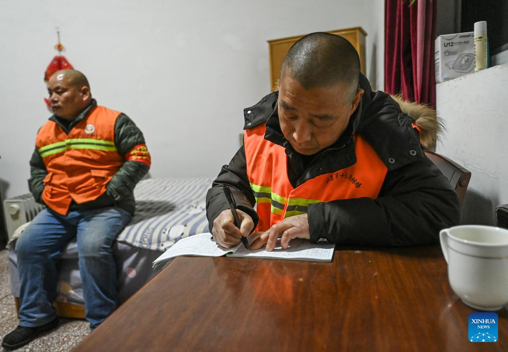 Song Chen (R) writes a log at his dormitory in the watchtower on Mangshan Mountain in Beijing, capital of China, March 18, 2022.