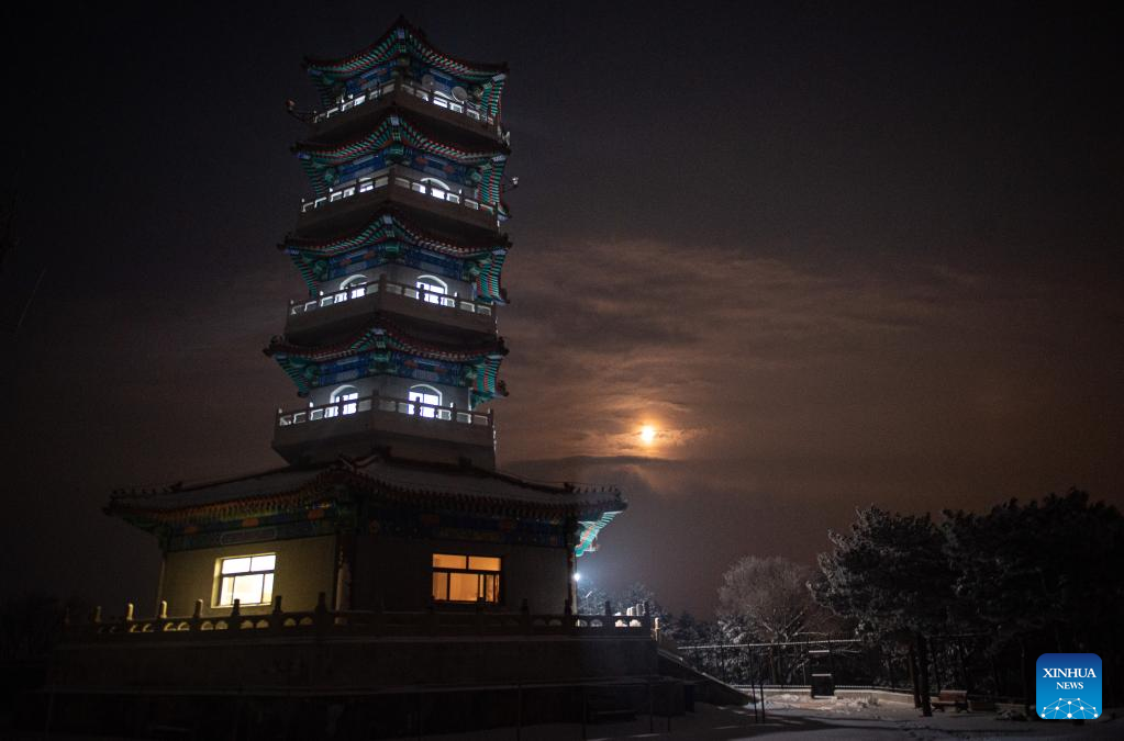 Photo taken on March 18, 2022 shows the night view of the watchtower on Mangshan Mountain in Beijing, capital of China.